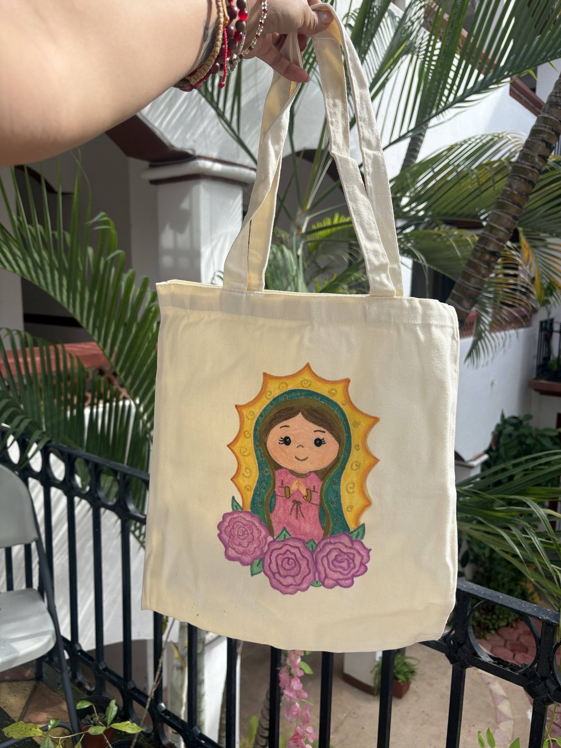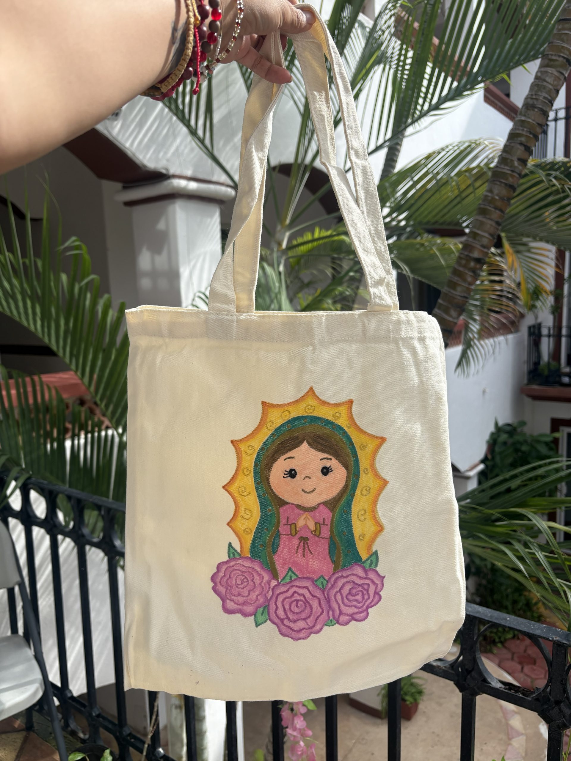 Bolsa de manta cruda pintada a mano con la imagen de la virgen de Guadalupe.